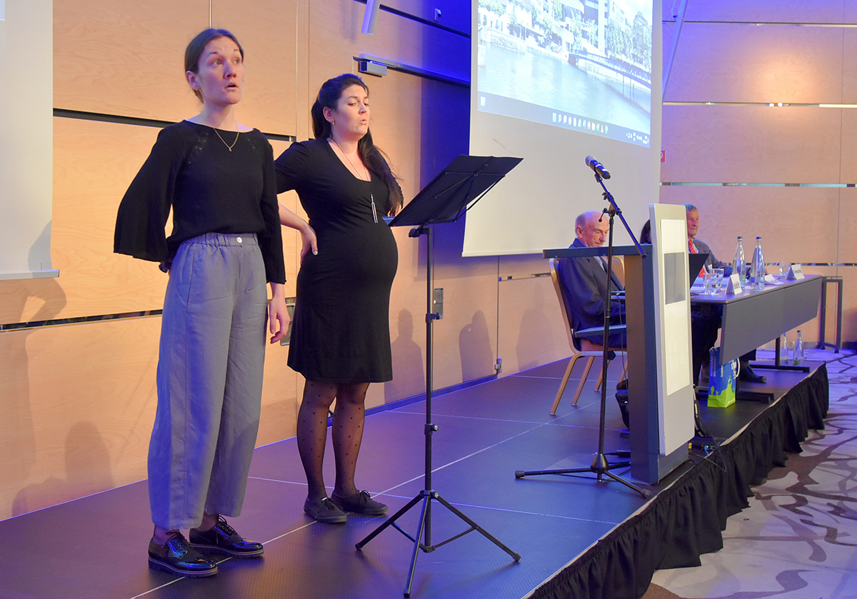 Die Vorträge der beiden Cousinen Braida und Sara Bignia Janett wurde sowohl vom Beschenkten als auch vom Publikum mit Begeisterung aufgenommen. Braida Janett studiert Master Music Pedagogy – Schulmusik in Zürich. Sie hat schon eigene Lieder komponiert und erfolgreich veröffentlicht. Sara Bigna Janett schloss ihr Gesangsstudium mit zwei Master ab, und sie durfte schon im Wiener Konzerthaus und der Berliner Philharmonie aufteten. Beide Künstlerinnen bleiben ihren Engadiner Wurzeln, der rätoromanischen Volksmusik, treu.