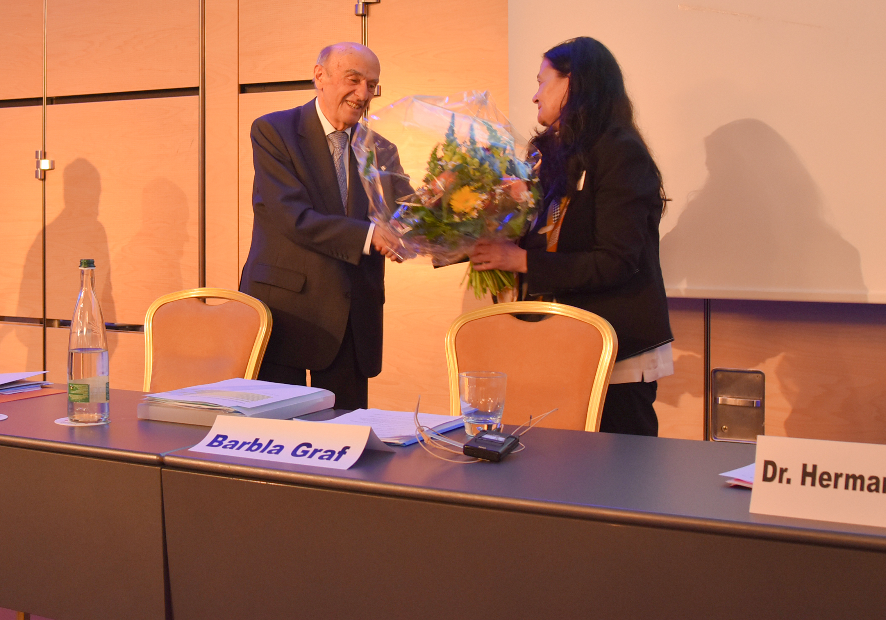 Alt Ständerat Hermann Bürgi, Vizepräsident der Schweizer Patenschaft für Berggemeinden, bedankte sich bei Hans-Rudolf Merz für sein Engagement. Dabei erinnerte er an dessen eigene Worte: «Die Patenschaft ist eine segensreiche Institution; sie dient der Lösung von konkreten Problemen der kleinsten politischen Einheiten und sorgt damit auch für die Kohärenz unseres Landes.» Diese Worte, meinte Herr Dr. Bürgi, seien es, die sein Engagement, seine Freude am Mitwirken sowie die für ihn unerlässliche Notwendigkeit uneigennütziger Hilfeleistung zugunsten der Bergregionen zum Ausdruck bringen: «Es sind dies die tragenden Werte, welche Deine präsidiale Zeit geprägt haben. Für Deine verdienstvolle und segensreiche Tätigkeit für die Patenschaft möchte ich Dir persönlich und im Namen der hier Anwesenden herzlich danken. Dein Wirken bleibt unvergessen.» Die Versammlung wählte Hans-Rudolf Merz mit Standing Ovations zum Ehrenmitglied. Barbla Graf schenkte Hans-Rudolf Merz als Dank für die langjährige von Respekt und Herzlichkeit getragene Zusammenarbeit eine musikalische Überraschung.