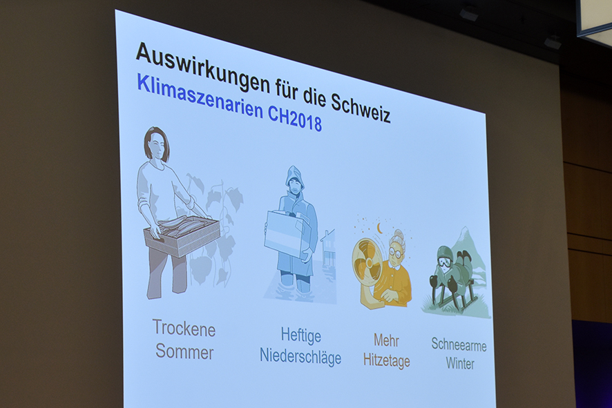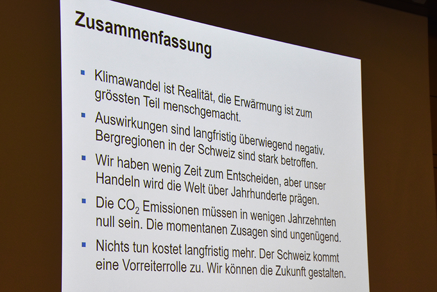 Im Anschluss an die ordentlichen Traktanden referierte Prof. Dr. Reto Knutti zum Thema «Klimaprognosen und deren Auswirkungen auf die Berggemeinden». Professor Knutti forscht am Institut für Atmosphäre und Klima an der ETH Zürich zu den Veränderungen im Klimasystem durch Treibhausgase sowie die Weiterentwicklung, Bewertung und Anwendung von Klimamodellen. Sein Fazit, basierend auf den erfassten Daten lautet: «Die Erwärmung ist eindeutig, der menschliche Einfluss auf das Klima ist klar.» Die Auswirkungen für die Schweiz sind trockene Sommer, heftige Niederschläge, mehr Hitzetage und schneearme Winter. Die Bergregionen sind davon besonders stark betroffen. Zusammenfassend sagt er: «Wir haben wenig Zeit zu entscheiden, aber unser Handeln wird die Welt über Jahrhunderte prägen. Die momentanen Zusagen bezüglich Klimaziele sind ungenügend. Nichts tun kostet langfristig mehr. Der Schweiz kommt eine Vorreiterrolle zu – wir können die Zukunft gestalten.»