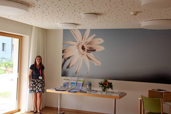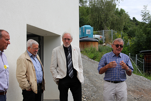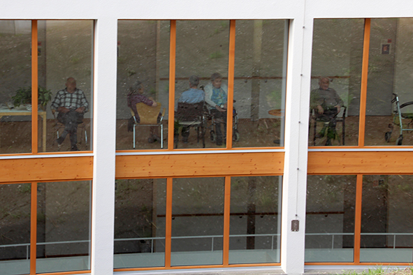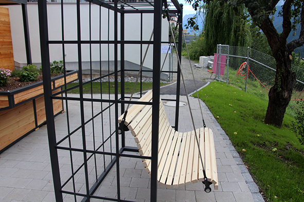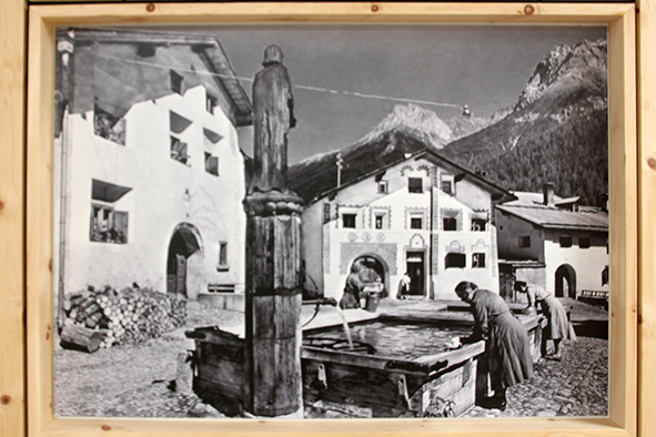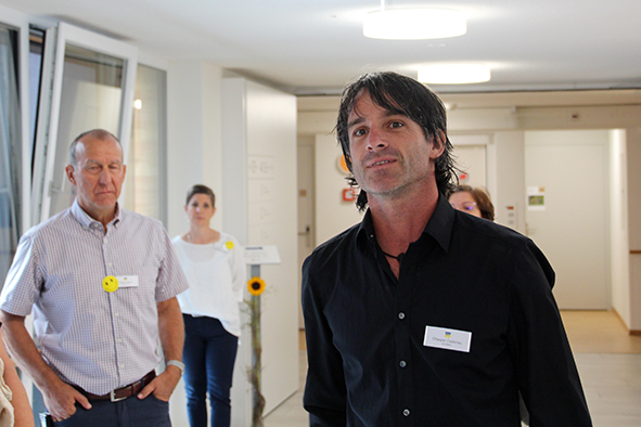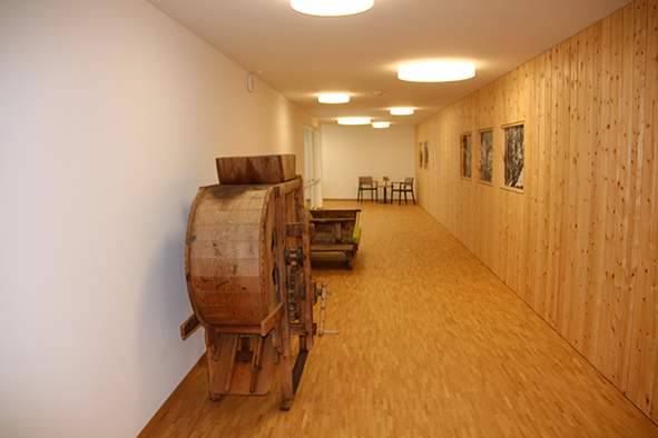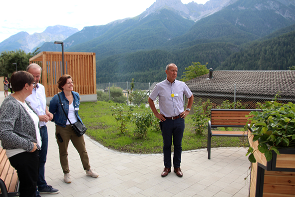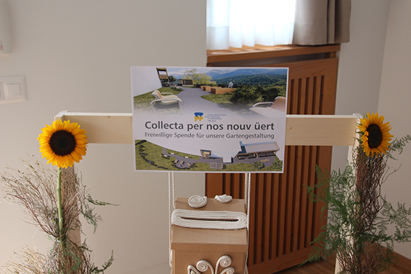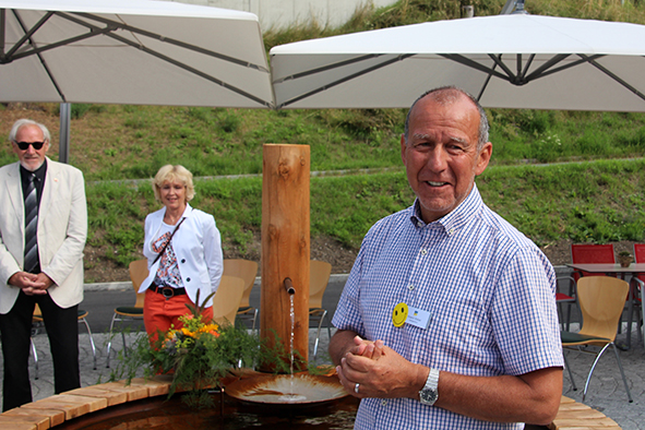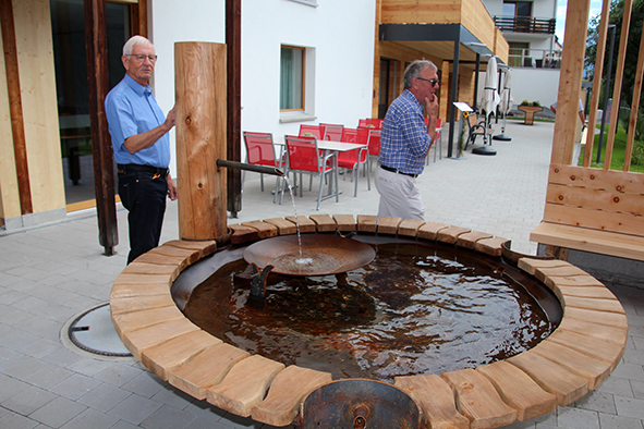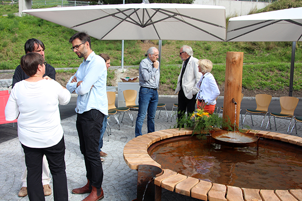 Der Architekt Chasper Cadonau zeig­te eben­falls auf, was seit der ersten Sitzung alles rea­li­siert wur­de. Beeindruckend waren sei­ne Ausführungen, wie die Einrichtungen die Sinne der Bewohnerinnen und Bewohner anspre­chen und anre­gen. Die bei­den Brunnen, gestal­tet vom Scuoler Bauern Jon Roner, kön­nen dank dem fröh­li­chen Plätschern auch von seh­be­hin­der­ten Menschen wahr­ge­nom­men wer­den (der Brunnen beim Eingang wur­de übri­gens schnur­stracks von Kindern in Beschlag genom­men). Die mit Arvenholz getä­fer­te Stube ruft mit ihrem Duft Erinnerungen ans Familienhaus wach. Beeren und Früchte im Garten der Demenzabteilung laden zum Schauen, Schmecken und Geniessen ein.