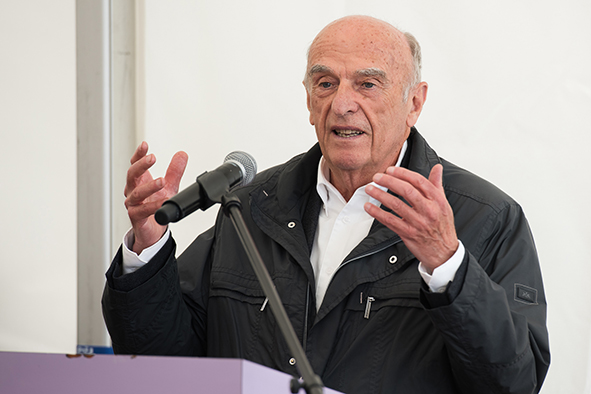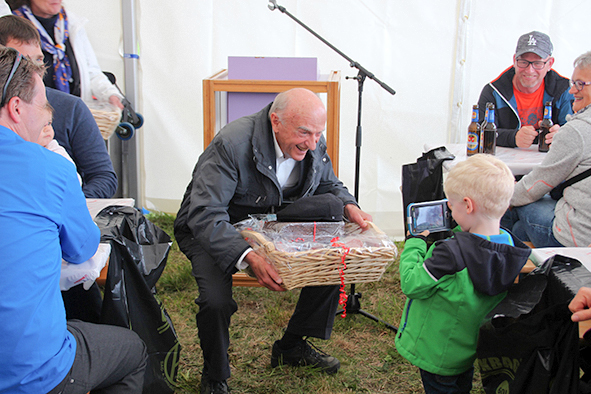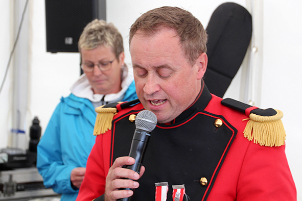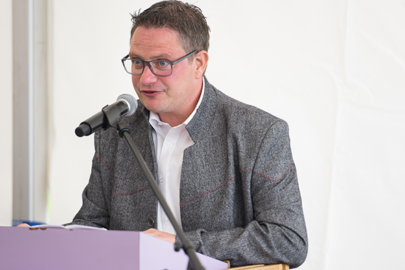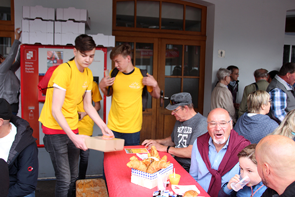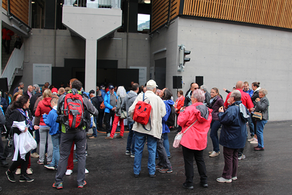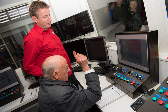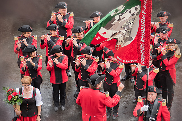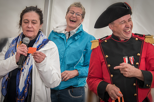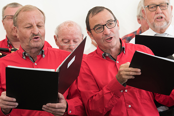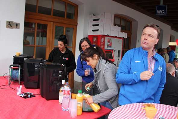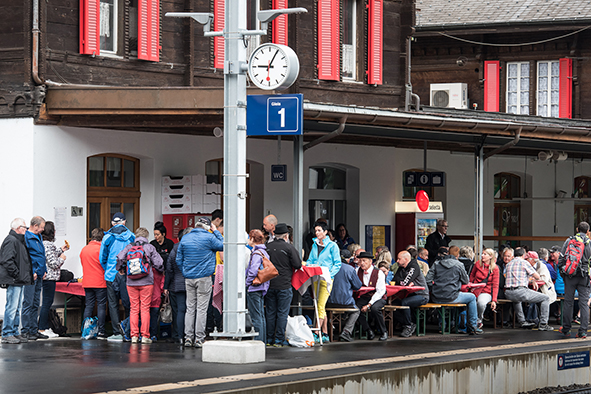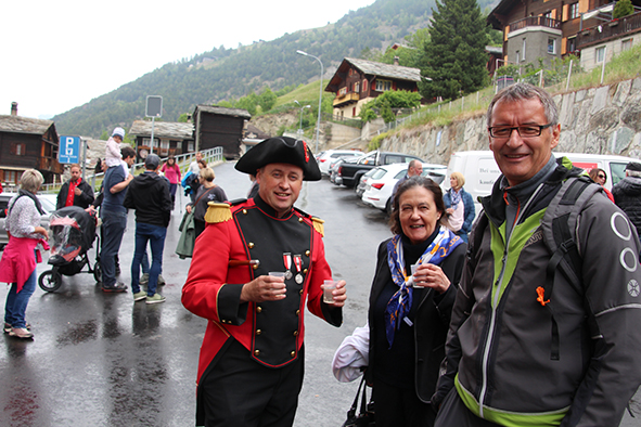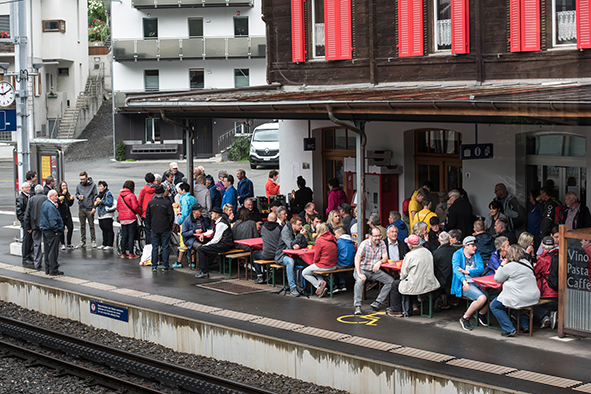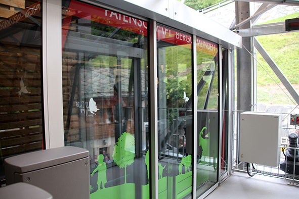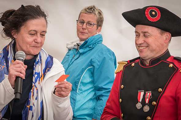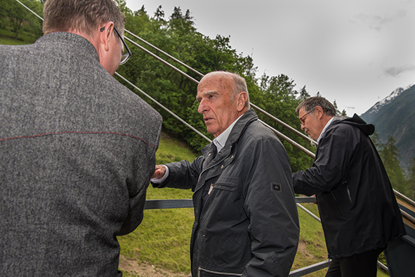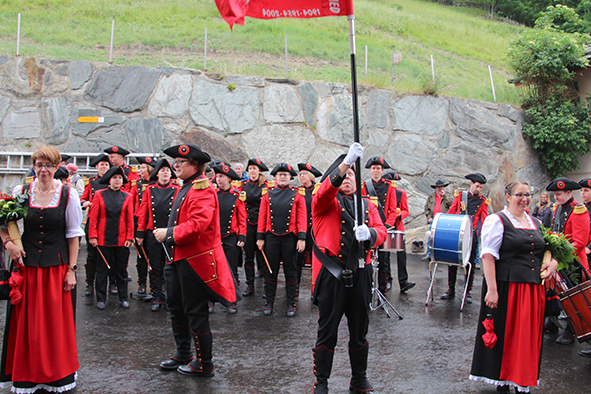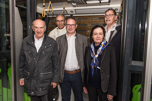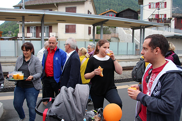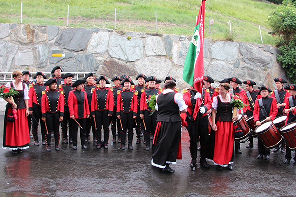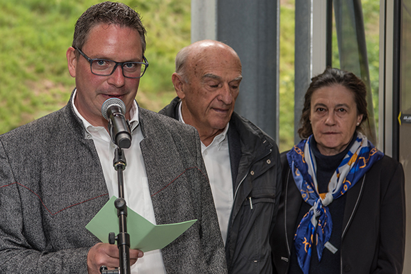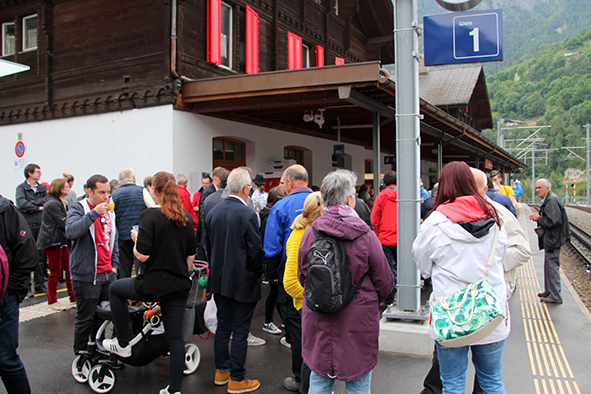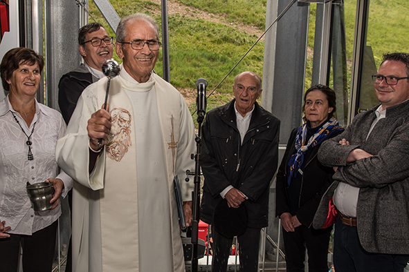 Gemeindepräsident Jürgen Brigger drückte seine Freude über die Wiederinbetriebnahme aus: «Besser verbunden schafft Freude und Freunde.» Mit seinen Worten verband er den Dank an die Schweizer Patenschaft für Berggemeinden und ihre Gönnerinnen und Gönner. An die Kosten von rund 21.5 Mio. Franken konnte die Schweizer Patenschaft für Berggemeinden 300’000 Franken aus dem Fonds Stephan und Viktoria Schmidheiny beitragen. Im Gegenzug gestaltete die Gemeinde eine Kabine im Patenschafts-Kleid. Diese Kabine wurde als Überraschung am Bähnlifäscht enthüllt. Als Gotte und Götti begingen der Präsident, alt Bundesrat Dr. Hans-Rudolf Merz, und Barbla Graf, Geschäftsleiterin, als Vertreterin von Viktoria Schmidheiny, die sich wegen eines Todesfalls in der Familie entschuldigen musste, den Taufakt. Dr. Hans-Rudolf Merz stellte in seiner kurzen Ansprache fest: «Wir freuen uns, dass jetzt eine weitere Botschafterin unserer Organisation unterwegs ist, den Solidaritätsgedanken unserer Gönnerinnen und Gönner einem breiten Publikum bekannt macht und auch zukünftige Sympathisanten anspricht.» Die festliche Taufe wurde durch die einheimischen Tambouren und Pfeiffer begleitet.