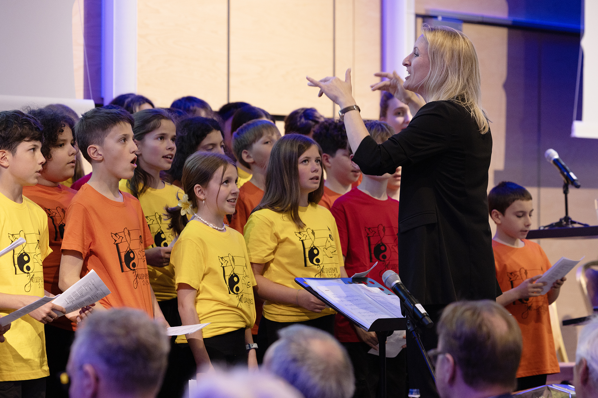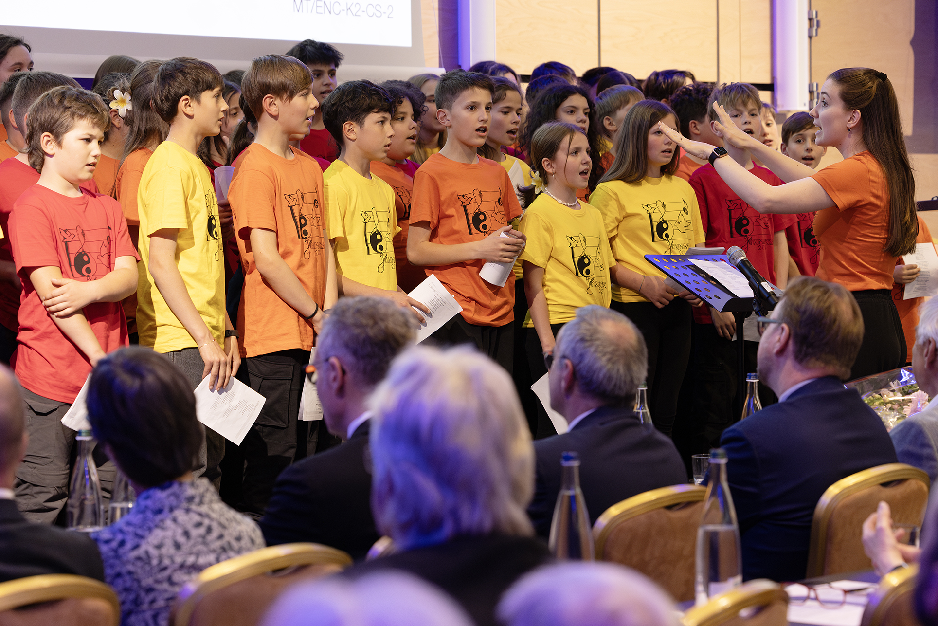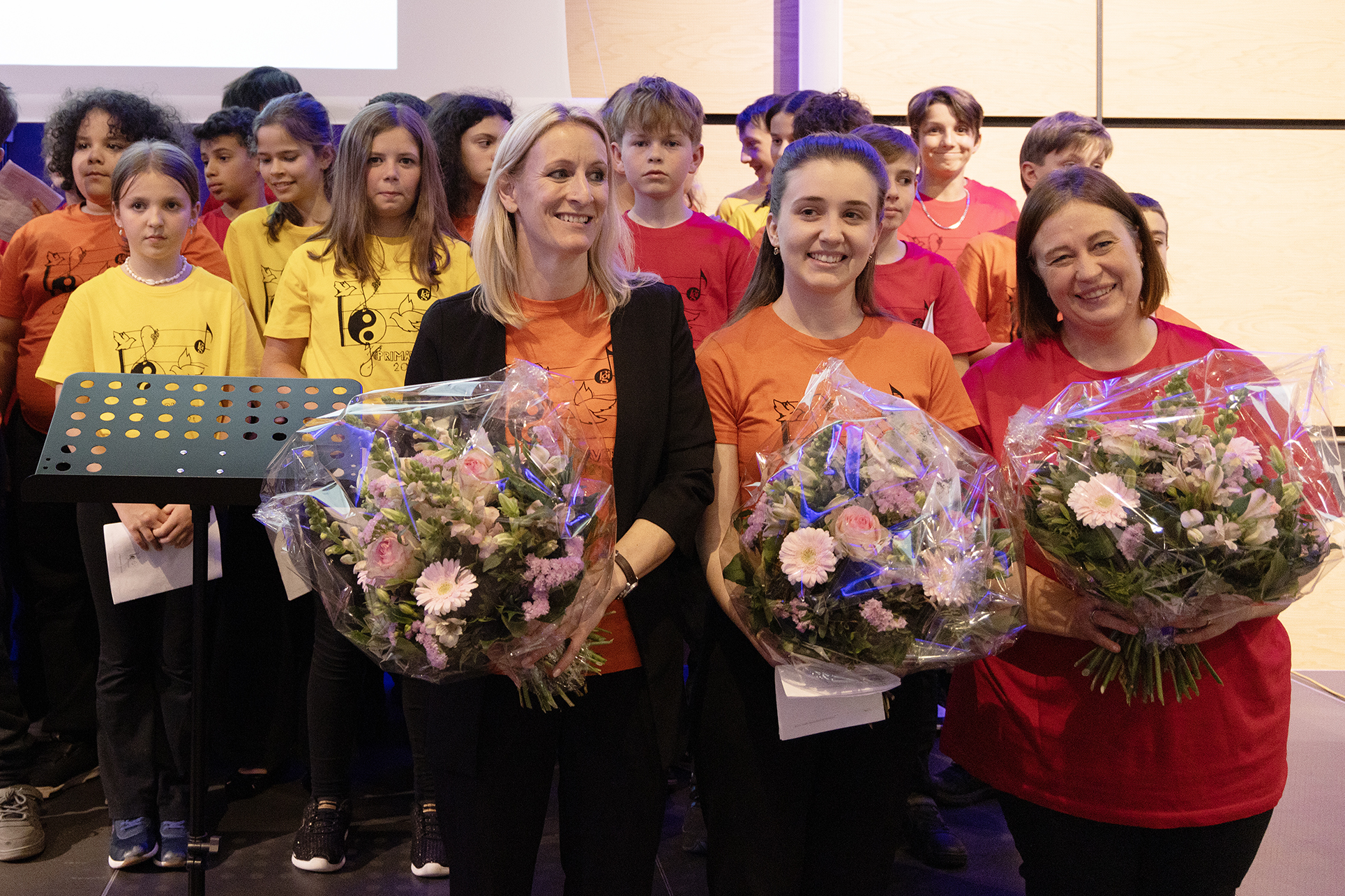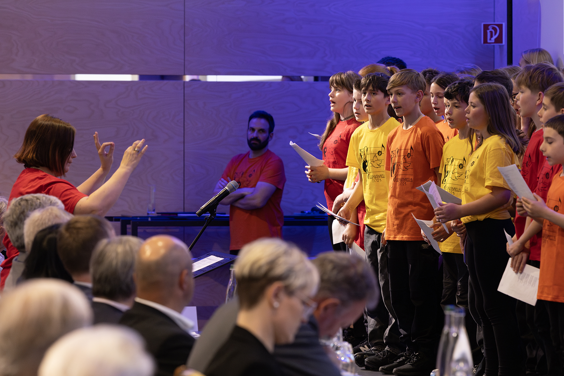 Den musikalischen Rahmen boten die 54 Schülerinnen und Schüler der 5. und 6. Klasse aus den Gemeinden Cama, Lostallo, Soazza und Mesocco unter der Leitung ihrer Musiklehrerinnen Ramona Plozza, Anna Giudicetti Rizzi und Vivian Mingozzi. Sie führten Musikstücke aus dem «Gran Concerto della Pace» von Gianfranco Perini auf. Anna Giudicetti Rizzi gab eine kurze Einführung: «Dieses Projekt liegt uns besonders am Herzen. Die Kinder überbringen mit den Liedern eine universelle Botschaft des Friedens und der Solidarität.» Das ganze Werk werden sie zusammen mit weiteren Kindern – insgesamt 220! – am 15. Mai in Bellinzona und am 24. Juni in Lostallo aufführen; ein Teil des Erlöses wird an die Bewältigung der Unwetterschäden im Misox fliessen. Mit der beherzten Darbietung der Misoxer Kindern bedankten sich die Südbündner Gemeinden und der Kanton Graubünden bei allen Anwesenden.