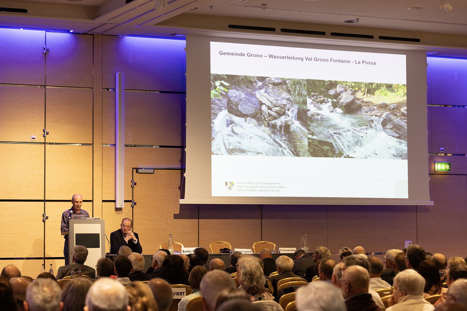 Luca Plozza zeigte mit eindrücklichen Bildern und Zahlen die Arbeiten auf, die seit dem ersten Tag nach dem Unwetter in den Gemeinden Cama, Grono, Lostallo, Mesocco, Roveredo und Soazza geleistet wurden. Häuser, Strassen, Brücken, Wasserleitungen, Kulturland, Schutzwälder und Schutzbauten waren betroffen. Hunderttausende Kubikmeter Schutt wurden bewegt, der Grossteil davon wurde für die Erhöhung bestehender Schutzbauten und für neue Ablenkdämme verbaut. Die Auffangbecken wurden schnellstmöglich geleert, so dass sie ihre Funktion bei einem nächsten Ereignis erfüllen können. Beeindruckend war die Darstellung der Organisation, die der Kanton und die Gemeinden in kürzester Zeit aufstellten – die Koordination und Kommunikation war ein wichtiger Faktor für die schnelle und effiziente Arbeit. Sorgen bereiten aber auch ihm die nächsten Jahre: Was zeigen die 60 Gefahrenkarten, die in den nächsten zwei Jahren neu erstellt werden, welche Folgeprojekte mit welchen Kosten entstehen daraus, was geschieht im Weiler Sorte mit seinen zerstörten Häusern – kann er geschützt werden oder erfolgt eine Umsiedelung? Er schloss seinen Bericht mit einem grossen Dank an die vielen Beteiligten und an die Gönnerinnen und Gönner der Schweizer Patenschaft für Berggemeinden.
