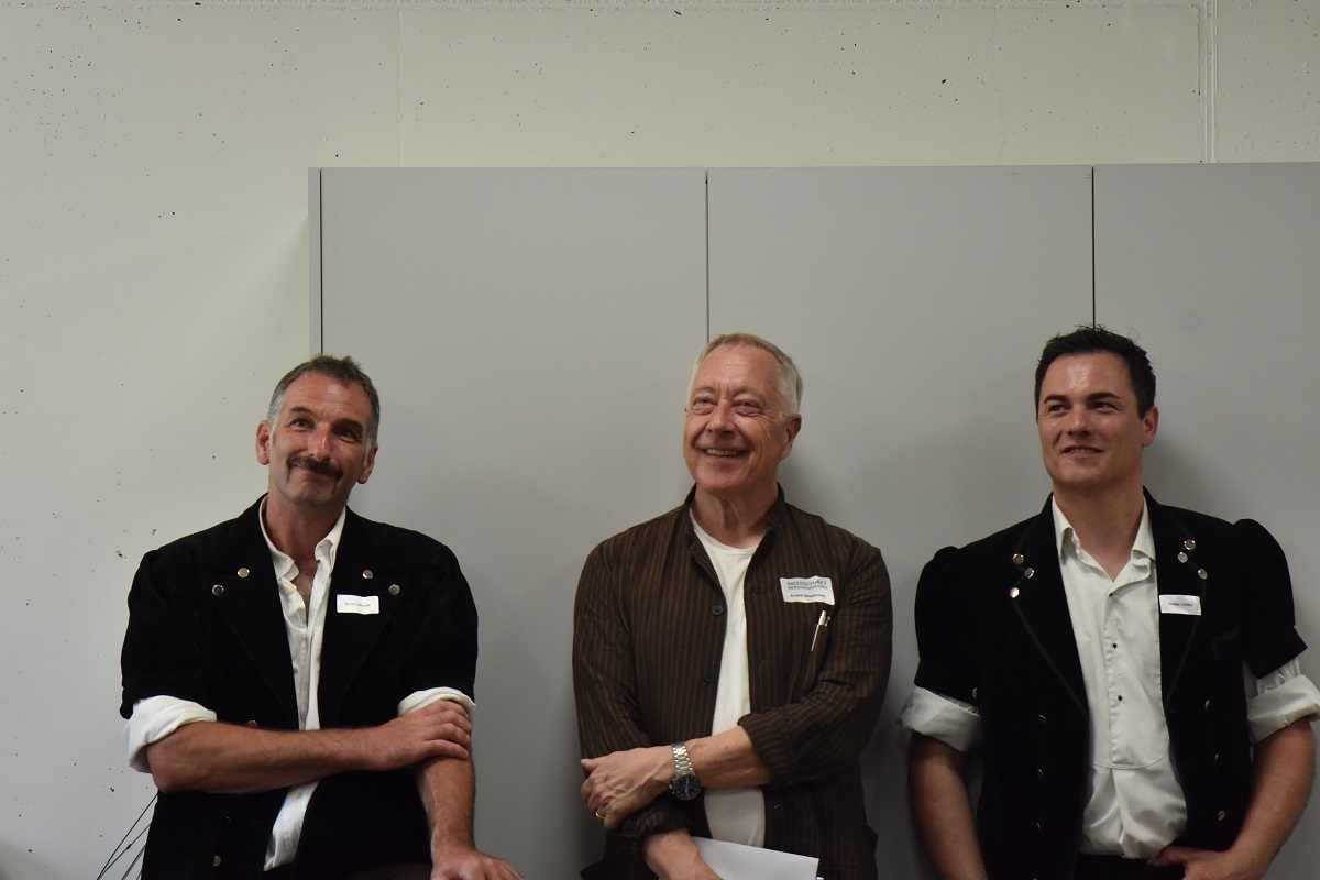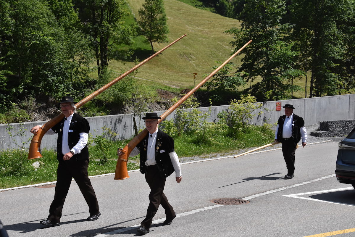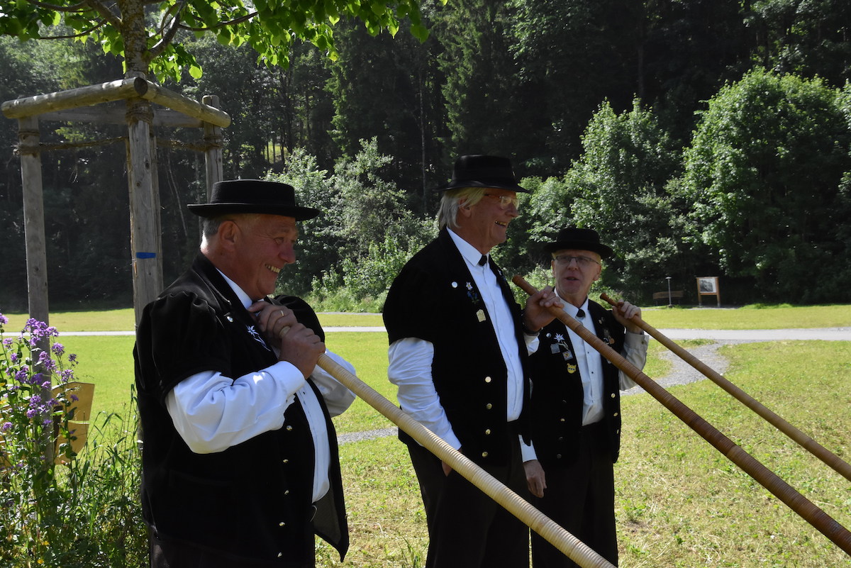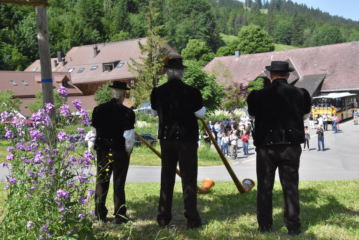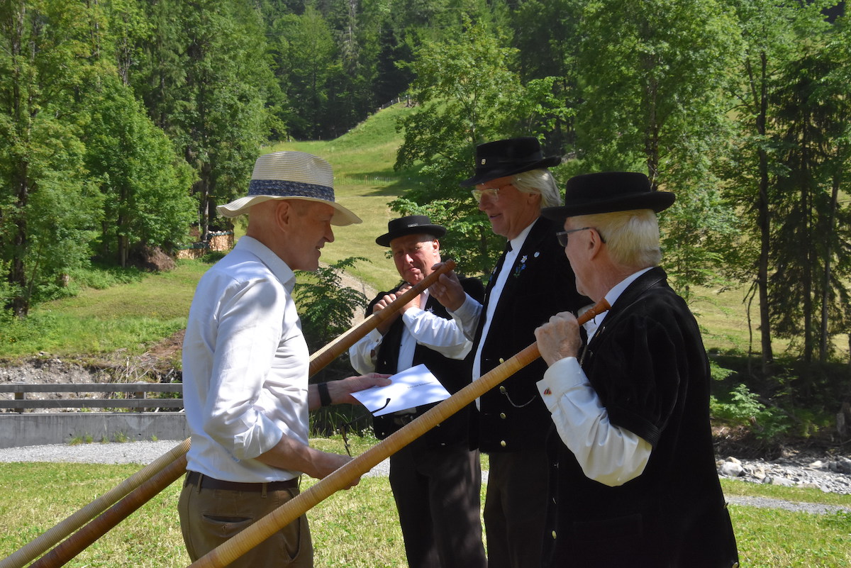 Nach dem feinen Apéro führte Beat Gerber die Gäste auf den Damm und zur Schutzmauer und beschrieb die baulichen Massnahmen, die den Flusslauf der Emme zukünftig in Schranken halten werden. Musikalisch begleitet wurde der Besuch im hintersten Emmental von den Alphornbläsern Hans-Ulrich Siegenthaler, Hans Liechti und Urs Müller.
