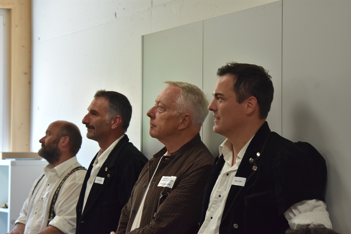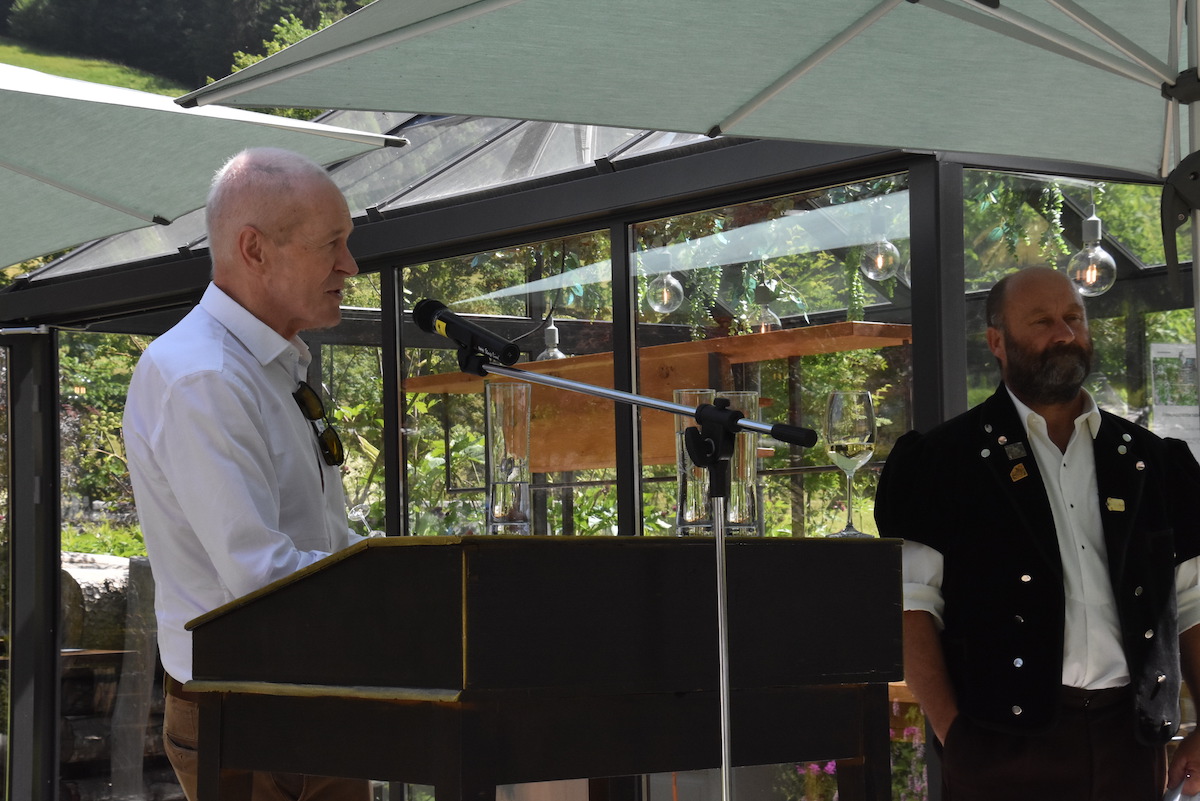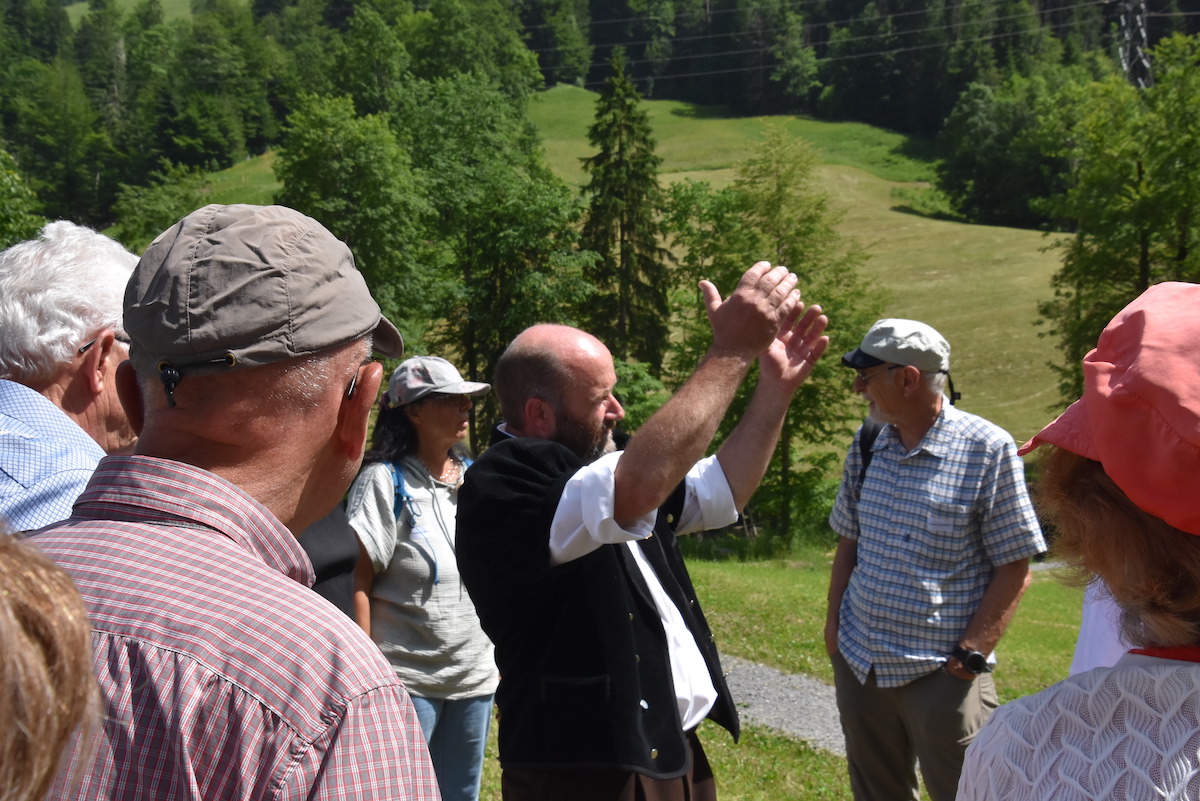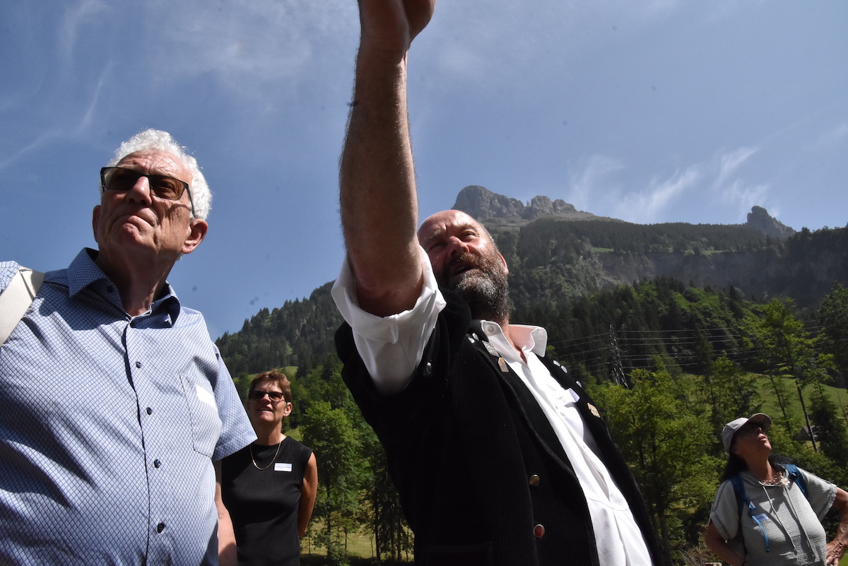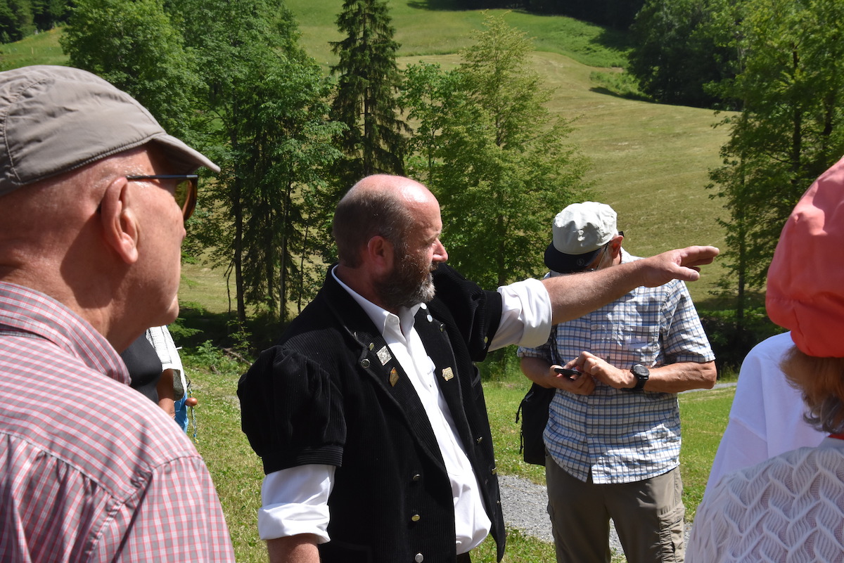 Die erste Station der Reise war der Gasthof Kemmeribodenbad. Hier begrüsste unser Präsident Werner Luginbühl die Gönnerinnen und Gönner, verbunden mit einem grossen Dank für ihre enorme Solidarität, die sich gerade am Beispiel Blatten wieder eindrücklich manifestiert. Er bedankte sich ebenso herzlich bei den Gastgebern für Empfang, Bewirtung und Betreuung. Unser Vorstandsmitglied André Blattmann gab sodann das Programm bekannt mit dem Hinweis, dass die Schutzbauten bestens aufzeigen, wohin die Spendenfranken gehen und warum Unterstützung immer wieder wichtig ist. Beat Gerber gab dann das Motto des Gemeinderats für den schönen Tag bekannt: «Wir wollen euch zeigen, was wir hier machen und wie wir unsere Traditionen leben.» Dazu gehörte selbstverständlich auch der Chüjermutz – die traditionelle Kutte – in dem die Behördenmitglieder auftraten.