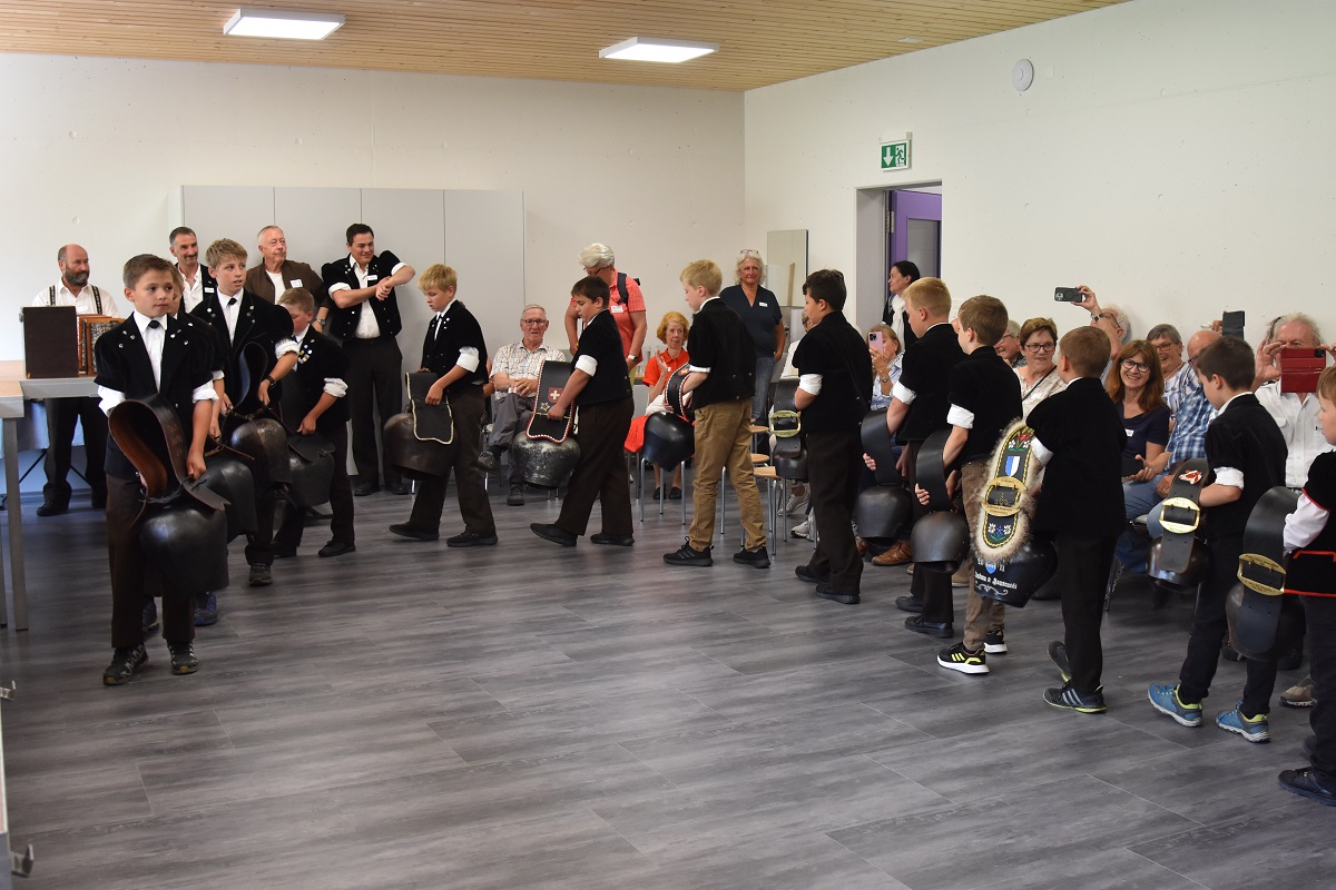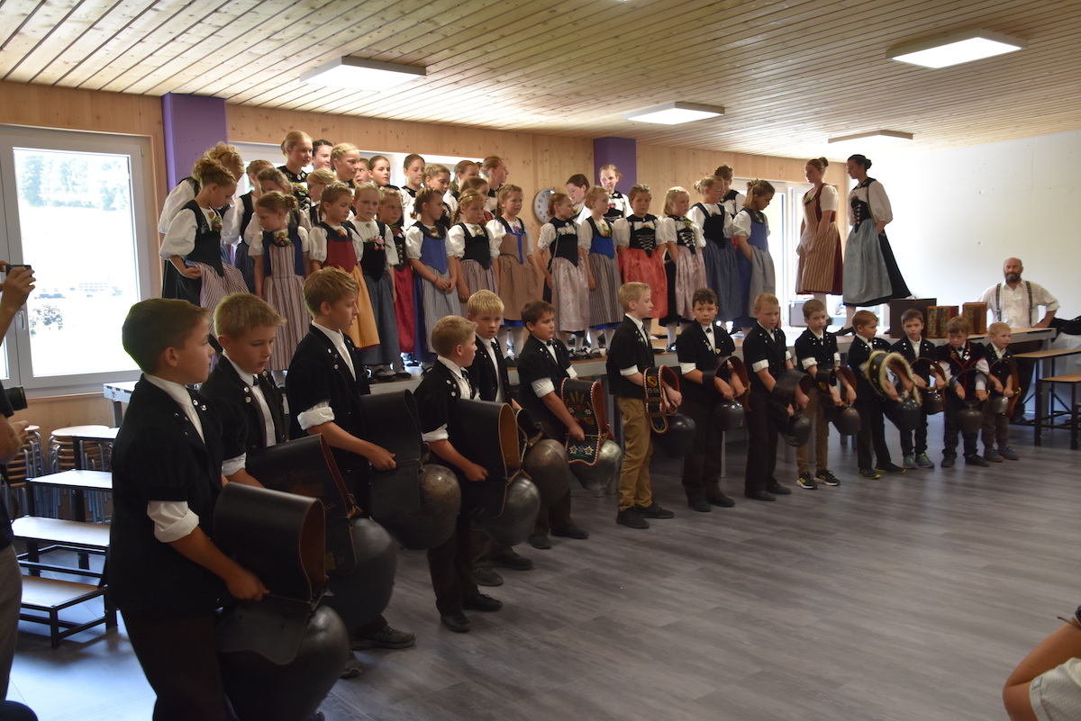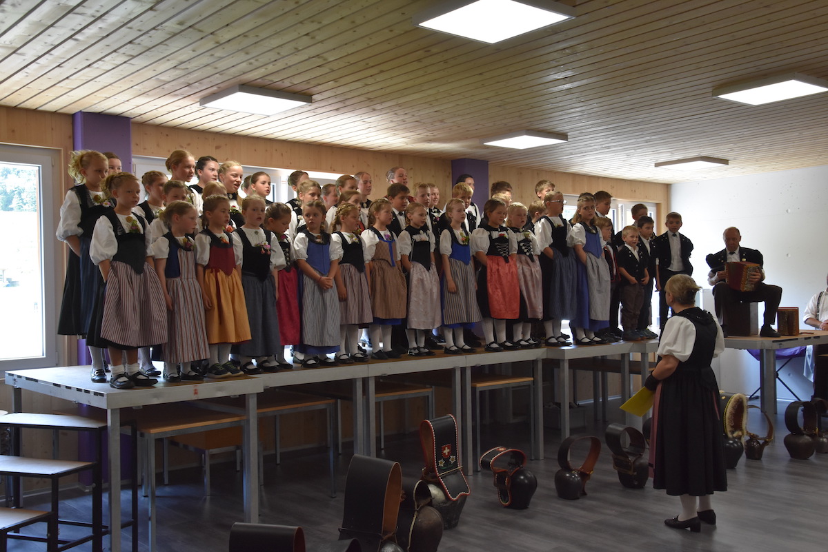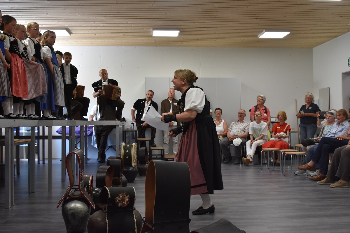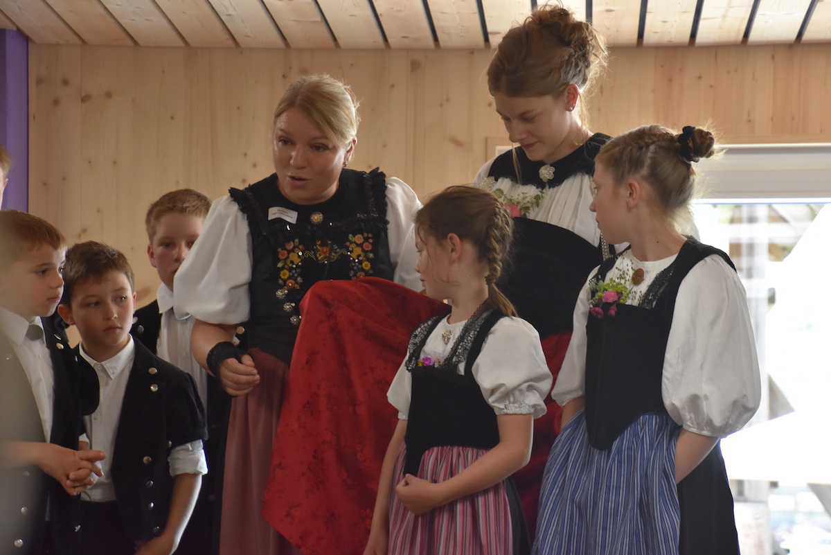 Dann ging es weiter zum Schulhaus Bumbach, dessen Neubau wir mit Spenden ebenfalls unterstützen konnten. Bruno Hirschi, Gemeinderat und Präsident der Baukommission, erläuterte die Überlegungen der Verantwortlichen: Im Zentrum standen Sicherheit, zeitgemässe Unterrichtsformen, flexible Räume, schlichte Bauweise und tiefe Unterhaltskosten. Mit Genugtuung erwähnte er, dass man den Neubau sogar unter Budget abschliessen konnte. Nun gehörte die Bühne dem Kinderchor unter der Leitung von Barbara Egli-Unternährer. Eröffnet wurde die Darbietung von den Buben, die mit ernster Miene ihre mächtigen Treicheln schwangen. Barbara Egli-Unternährer gab auch einen kurzen Exkurs in die Trachtenkunde: Mit der Berner Sonntagstracht, der Ausgangstracht, der Landfrauen- und der Gotthelftracht sowie dem Schangnauer Mutz waren alle gängigen Modelle vertreten.