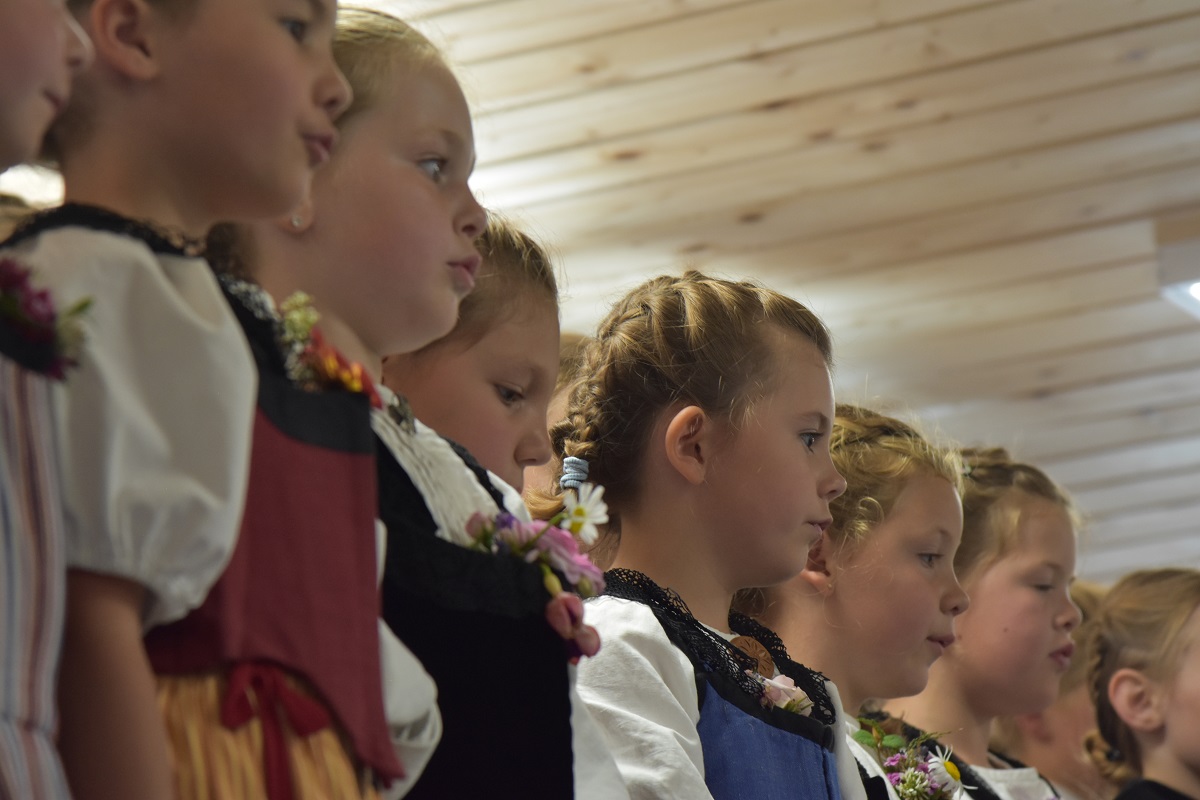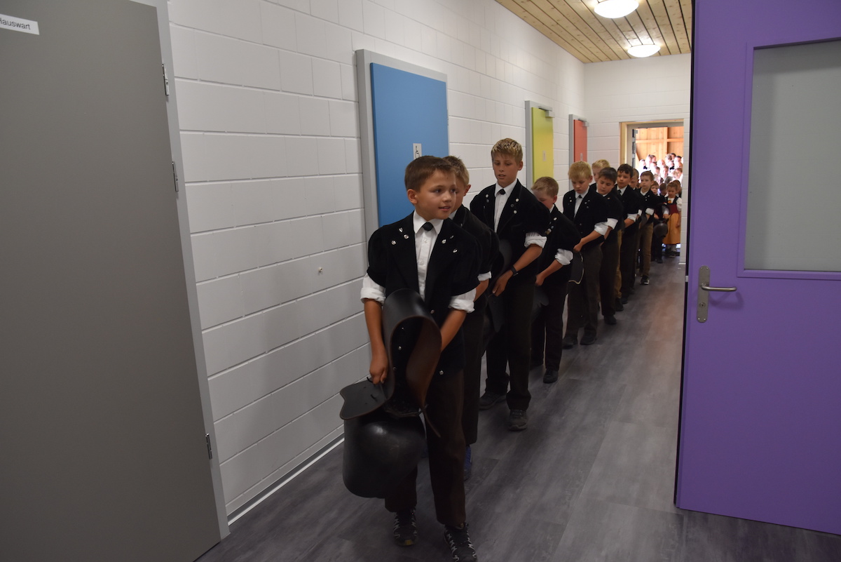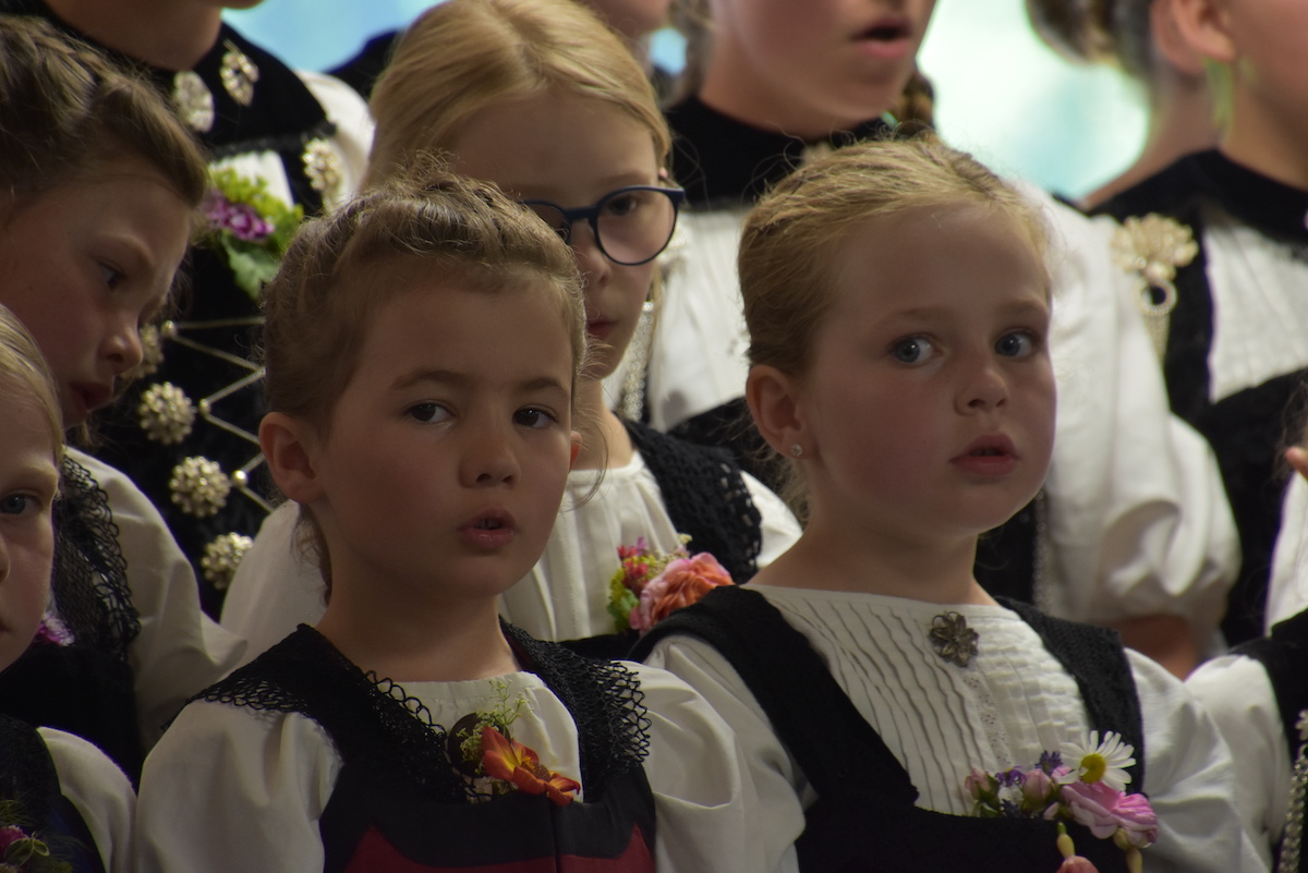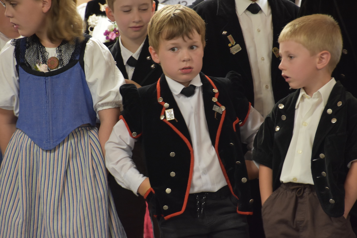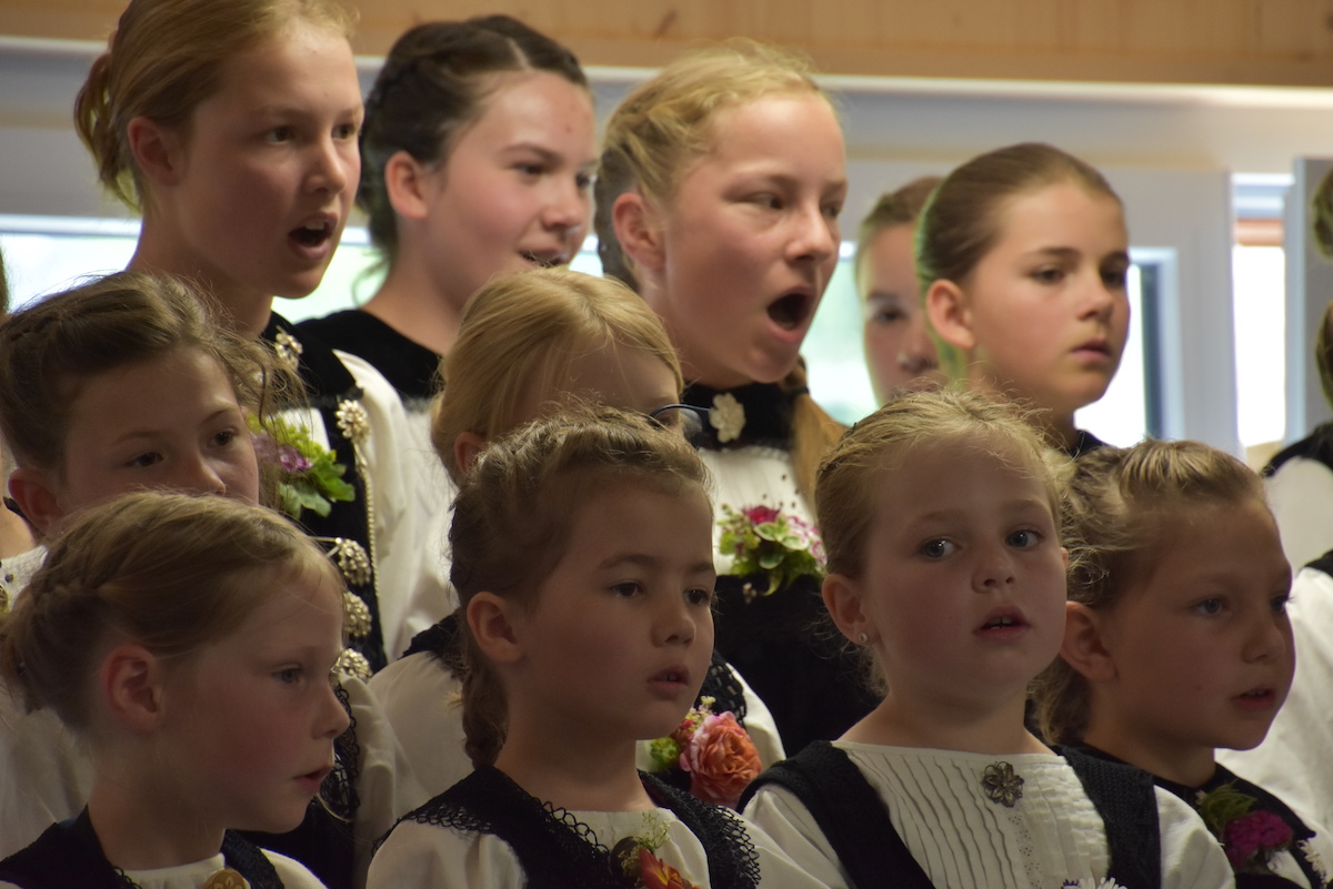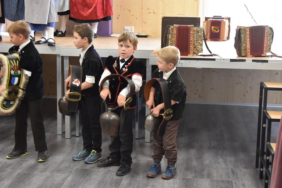 Dann ging es weiter zum Schulhaus Bumbach, dessen Neubau wir mit Spenden ebenfalls unterstützen konnten. Bruno Hirschi, Gemeinderat und Präsident der Baukommission, erläuterte die Überlegungen der Verantwortlichen: Im Zentrum standen Sicherheit, zeitgemässe Unterrichtsformen, flexible Räume, schlichte Bauweise und tiefe Unterhaltskosten. Mit Genugtuung erwähnte er, dass man den Neubau sogar unter Budget abschliessen konnte. Nun gehörte die Bühne dem Kinderchor unter der Leitung von Barbara Egli-Unternährer. Eröffnet wurde die Darbietung von den Buben, die mit ernster Miene ihre mächtigen Treicheln schwangen. Barbara Egli-Unternährer gab auch einen kurzen Exkurs in die Trachtenkunde: Mit der Berner Sonntagstracht, der Ausgangstracht, der Landfrauen- und der Gotthelftracht sowie dem Schangnauer Mutz waren alle gängigen Modelle vertreten.