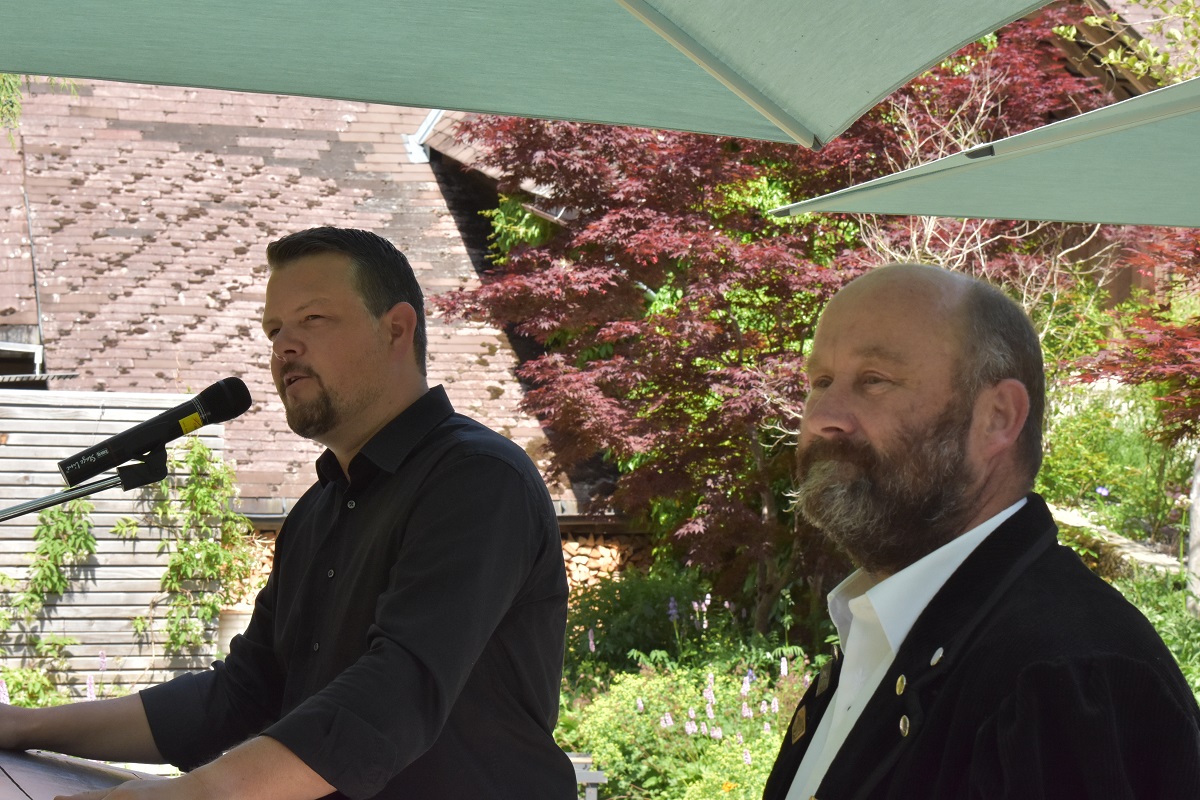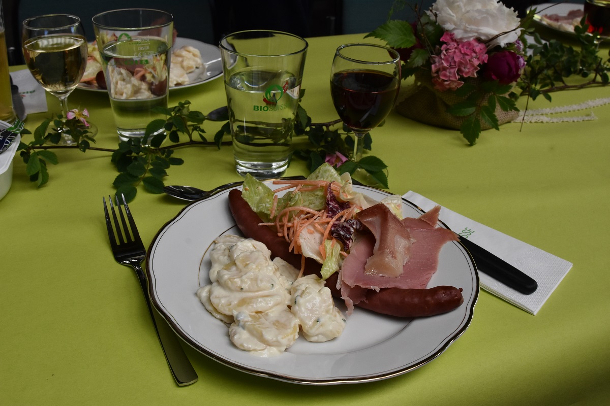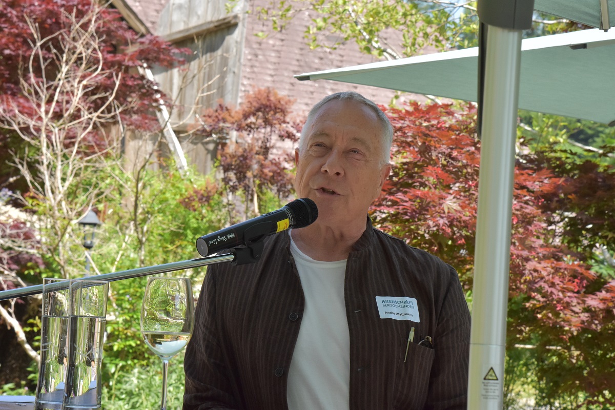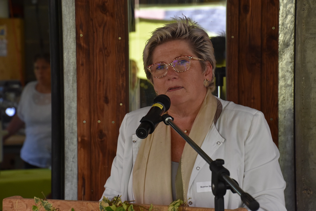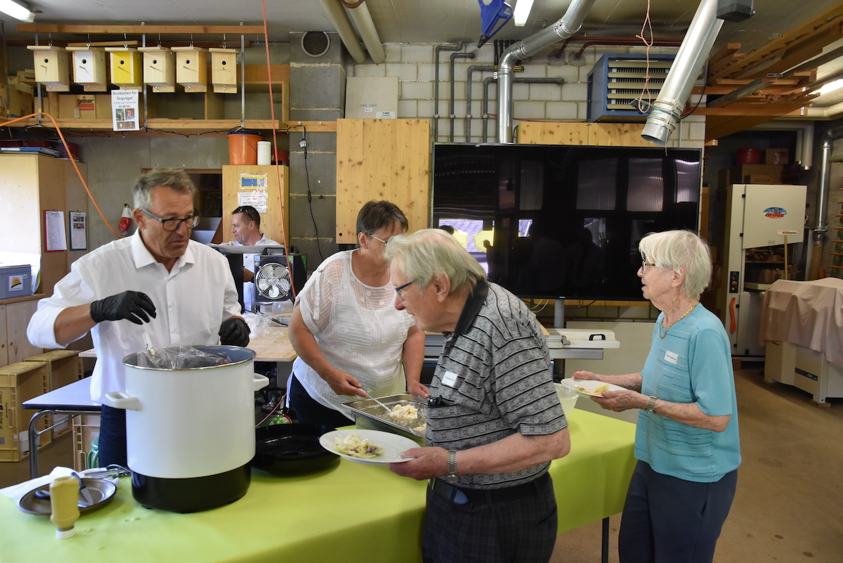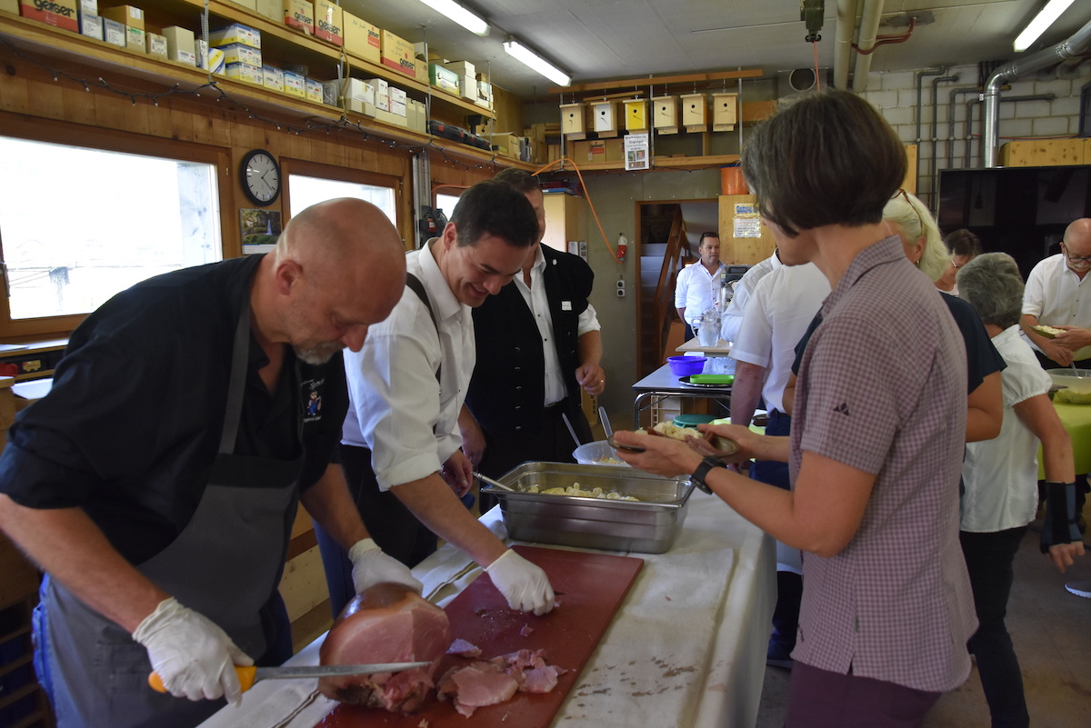 Der nächste Höhepunkt war das Mittagessen auf dem Arche-Hof von Kathrin und Beat Gerber. Auf ihrem Betrieb züchten sie eine ganze Reihe von ProSpecieRara-Tieren – Hühner, Schafe, Ziegen, Kühe und Schweine – sowie diverse Obstsorten. Der gesamte Gemeinderat stand zum Service bereit. Das traditionelle Menu bestand aus Salat, Kartoffelsalat, Wurst, Hamme, Chäsbrägel (Raclette) sowie Züpfe – und zum Abschluss gab es natürlich Meringue mit Schlagrahm. Jetzt wandte sich alt Regierungsrätin Beatrice Simon mit einem grossen Dank an die Gönnerinnen und Gönner: «Hier sieht man, wie die Natur uns manchmal den Meister zeigt. Ihr, liebe Gönnerinnen und Gönner, habt erkannt, wie wichtig Unterstützung in solchen Situationen ist.»