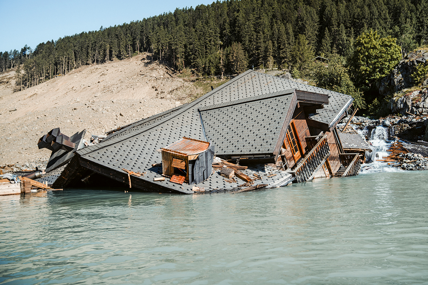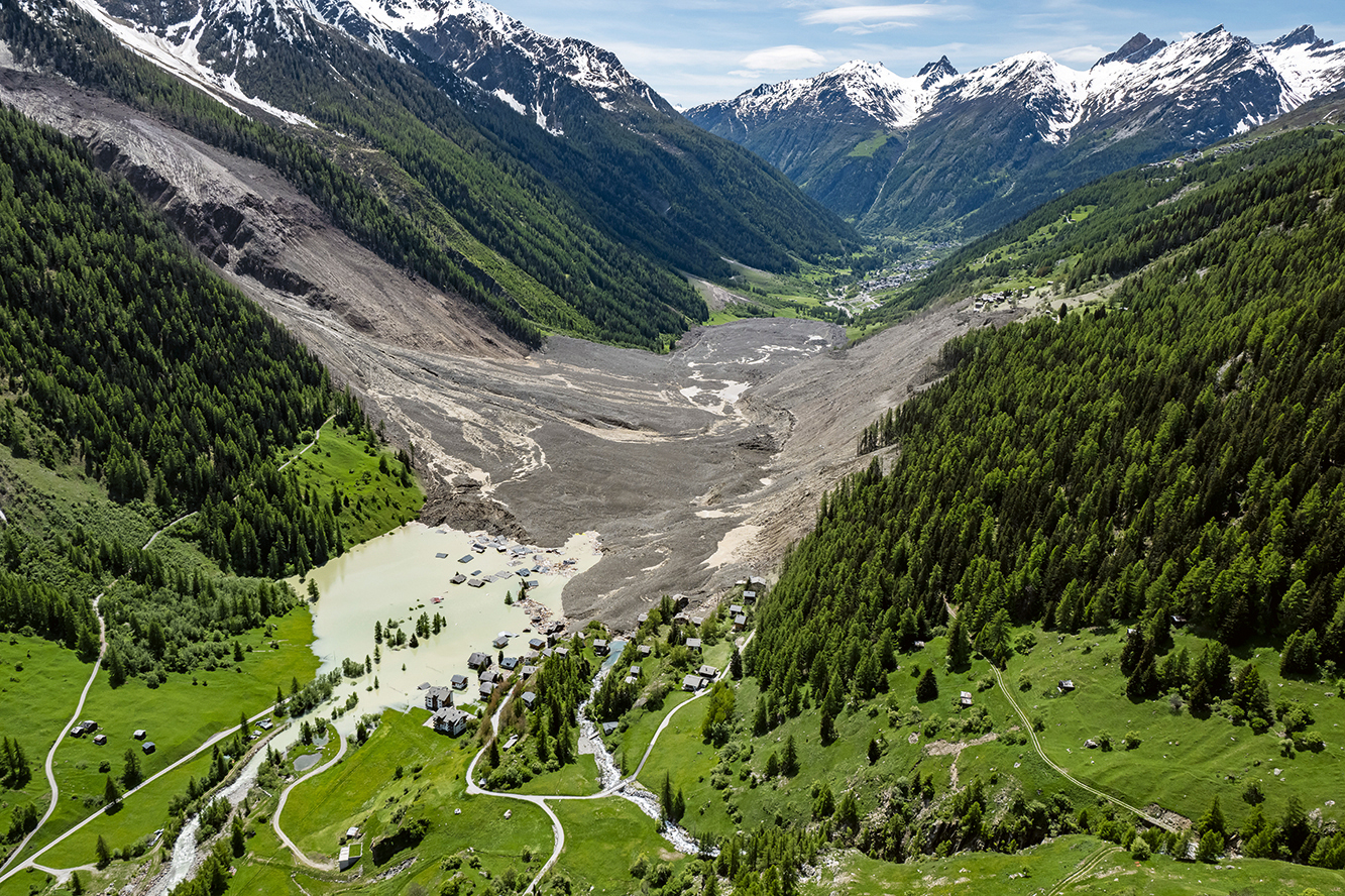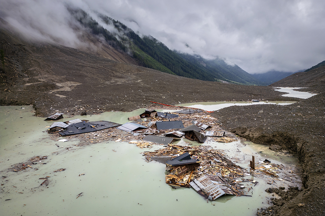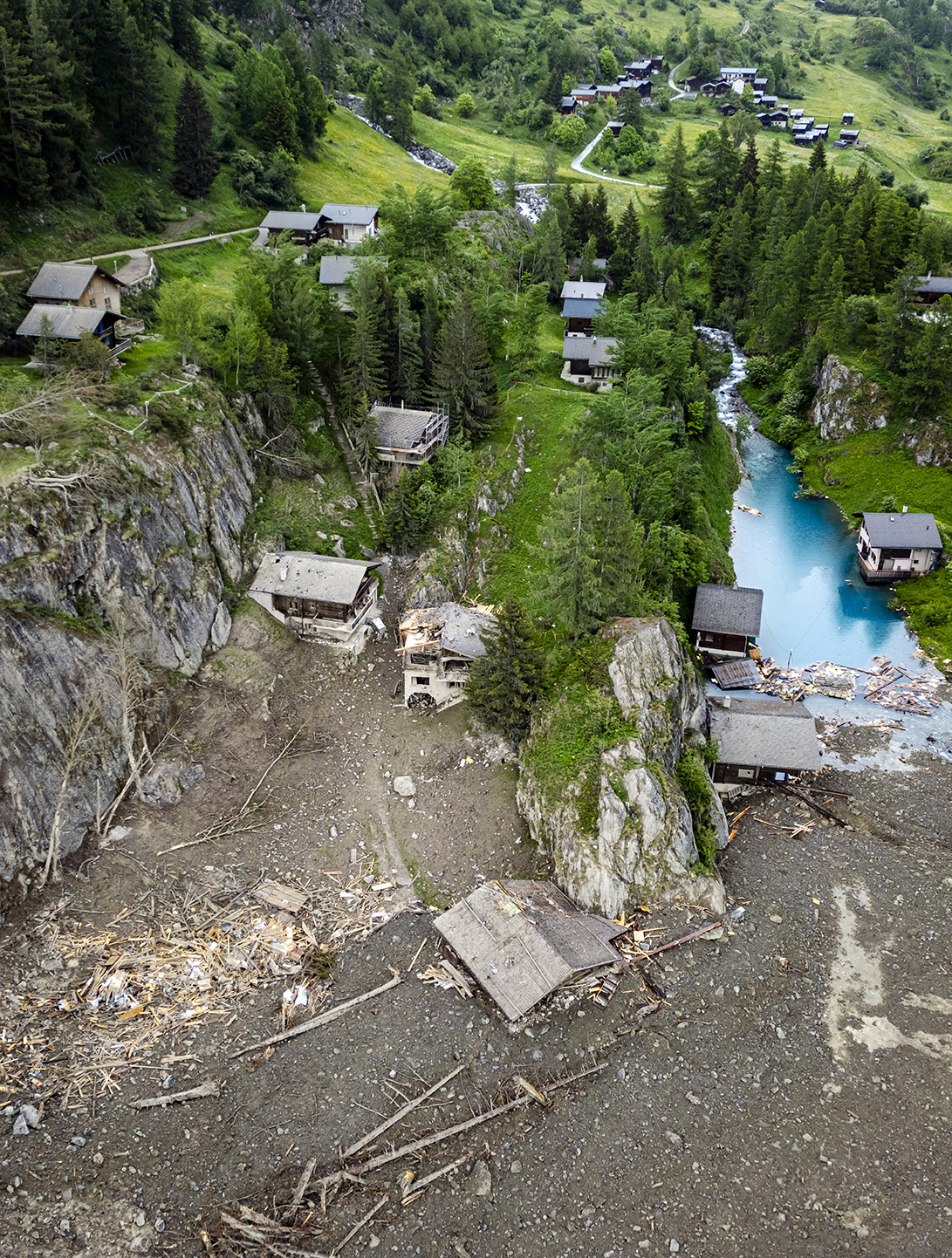 10 Tage spä­ter haben wir die trau­ri­ge Gewissheit: Der Birchgletscher ist abge­stürzt und hat gross­flä­chi­ge Murgänge oder Erdrutsche aus­ge­löst, das Dorf unter sich begra­ben und Häuser und Infrastrukturen zerstört.