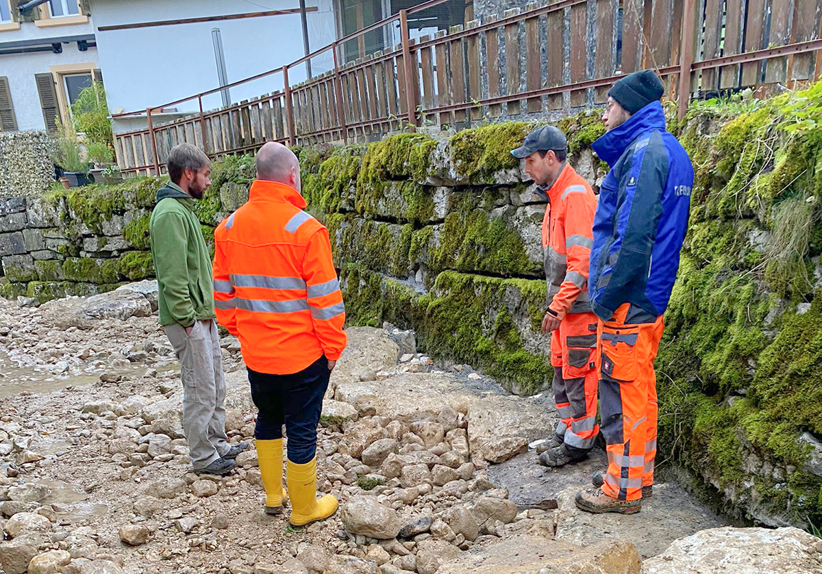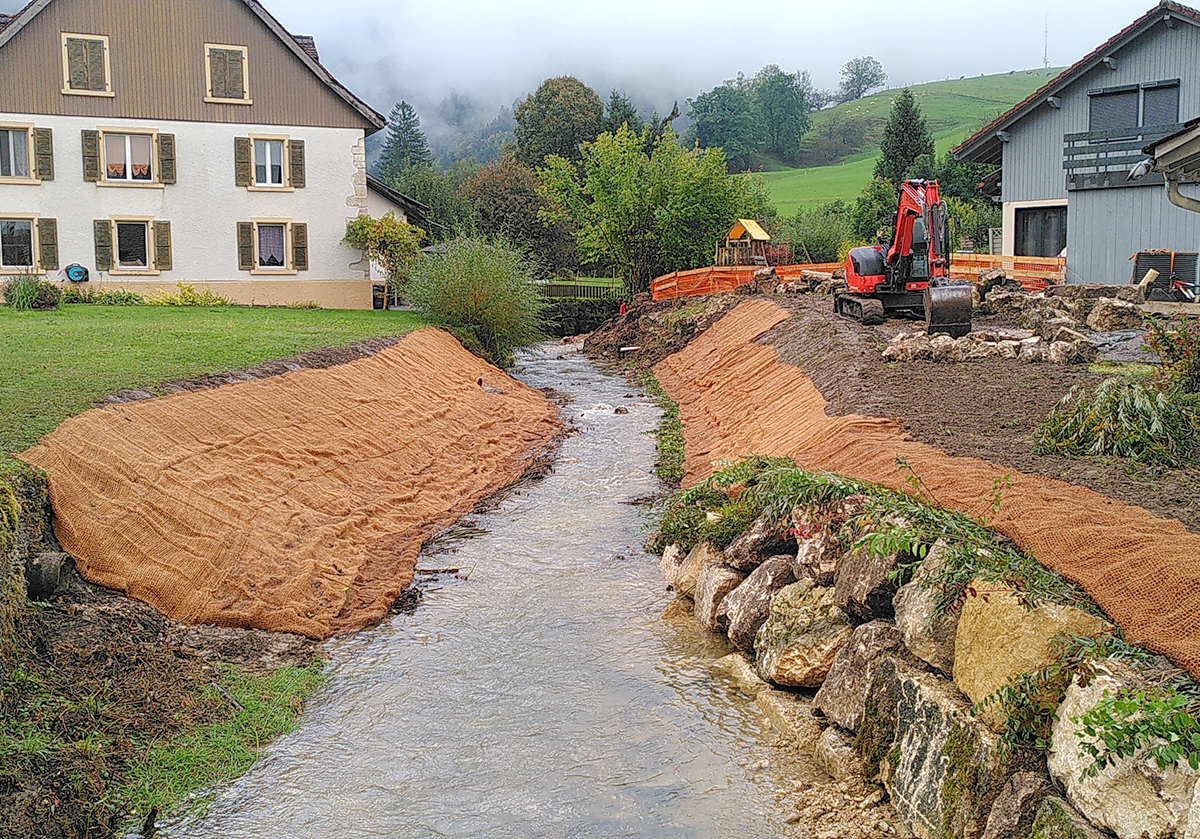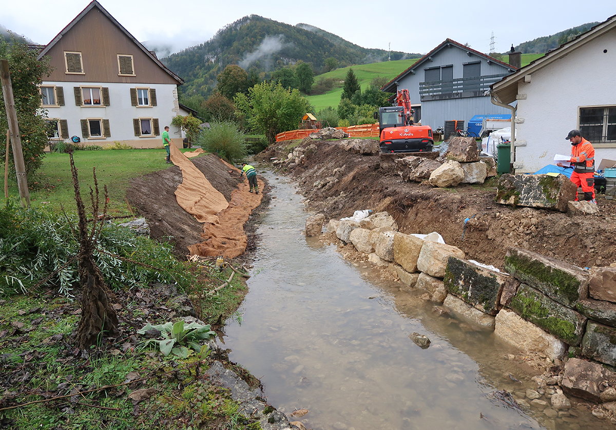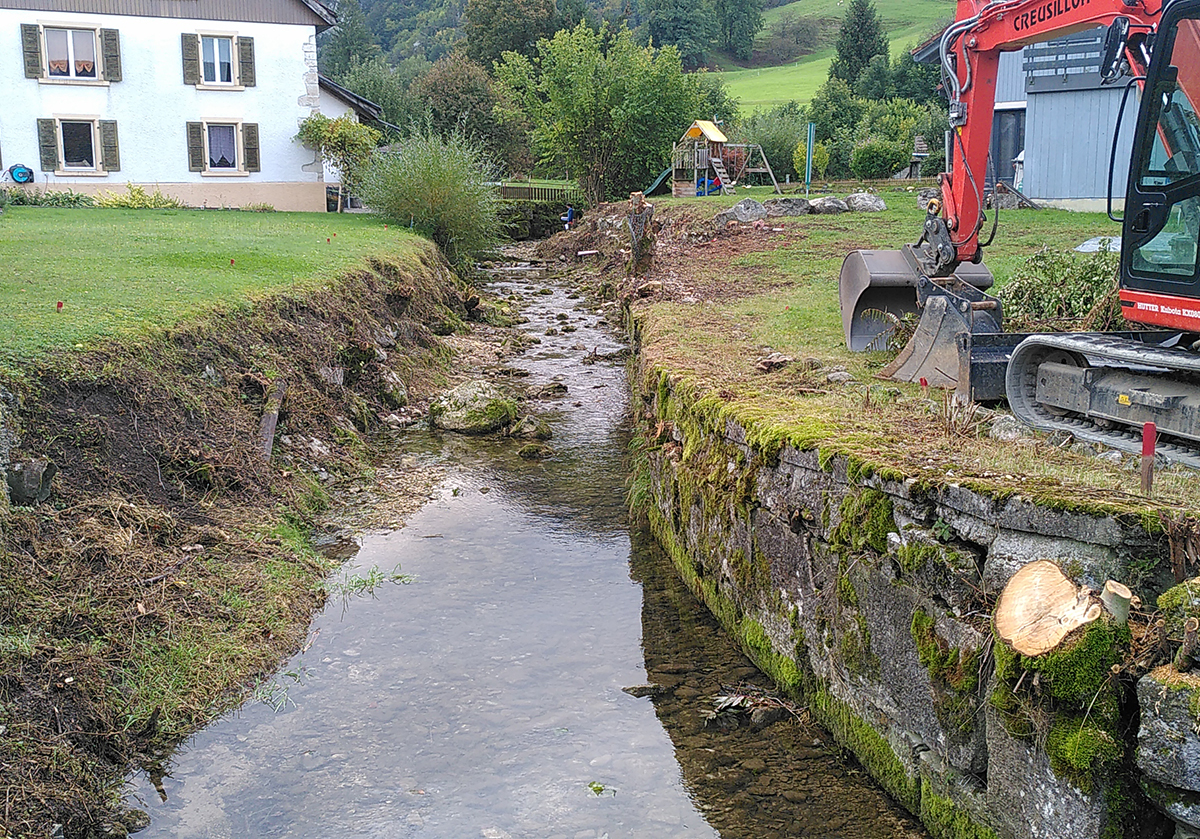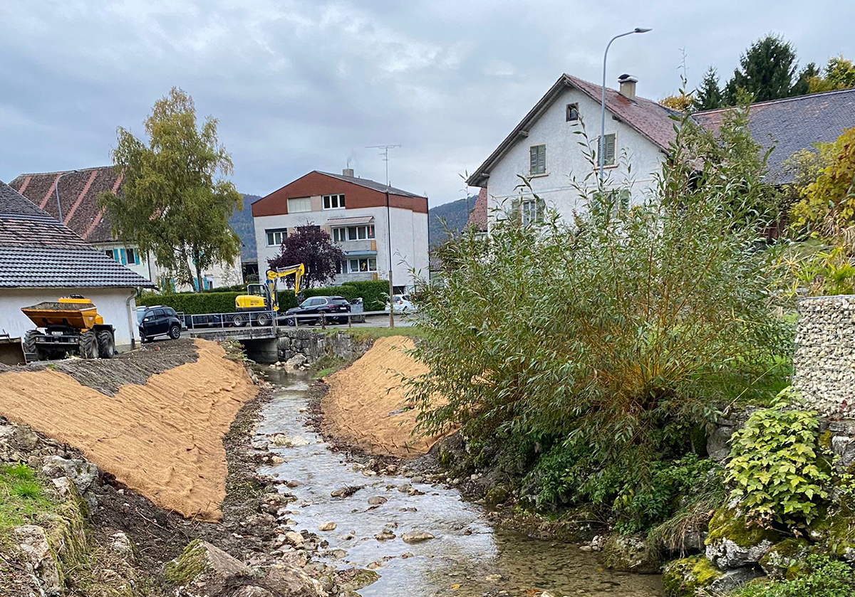 Die Scheulte in Mervelier ist ein kleines, beschauliches Rinnsal, das nach einem starken Regenfall plötzlich auf das 10 - 20-fache anschwellen kann. Die Ufer sind vor vielen Jahren mit quadratischen Felsblöcken senkrecht gemauert und befestigt worden. Nun sind vor allem in den unteren Schichten Lücken entstanden, die bei jedem Hochwasser grösser werden.