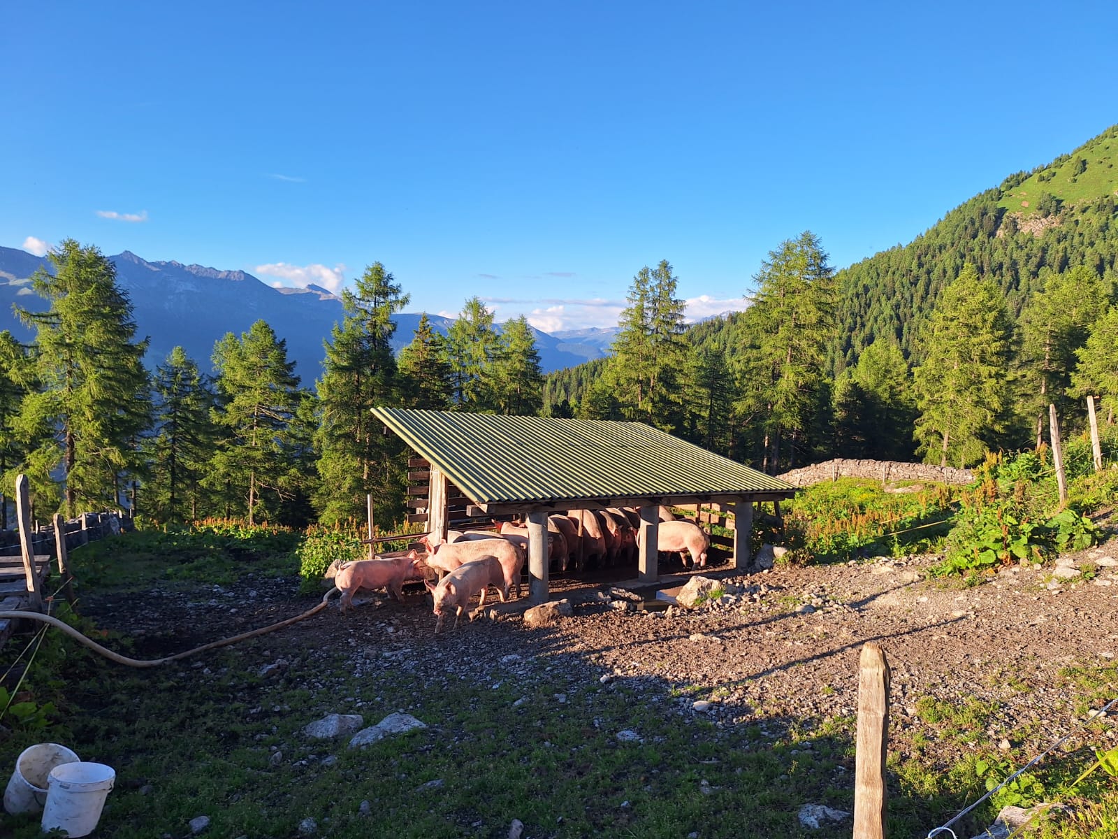 Beim Stallgebäude werden die Anbindevorrichtungen für die Milchkühe erneuert. Der bestehende Gülletank wird entfernt und eine neue Güllegrube erstellt. Unterhalb des Stallgebäudes und oberhalb der Güllegrube kommt der Aufenthaltsbereich der Schweine zu liegen. Über die gesamte Stalllänge wird ein Vordach von 2 m erstellt. Darunter entsteht der neue Liege- und Fressbereich der Schweine. An der Westfassade des Stallgebäudes wird der bestehende Anbau abgebrochen und ein neuer Anbau mit Milchkammer, Technikraum und Futterlager für die Schweine sowie ein Raum für die Schottentänke realisiert.